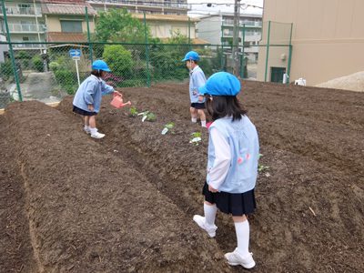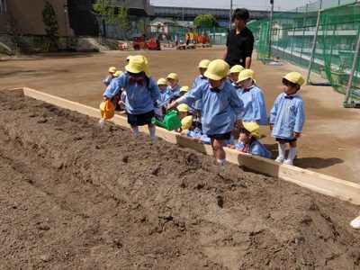 連休中に完成した園庭の畑に年中さんは枝豆の種を撒きました。