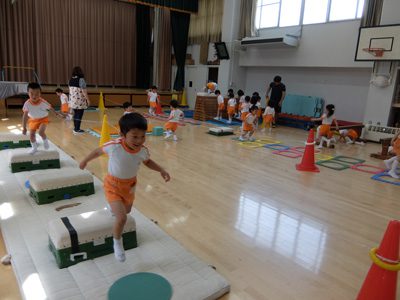 年長さんは体育遊びの日です。サーキット形式でさまざまな運動をしました。