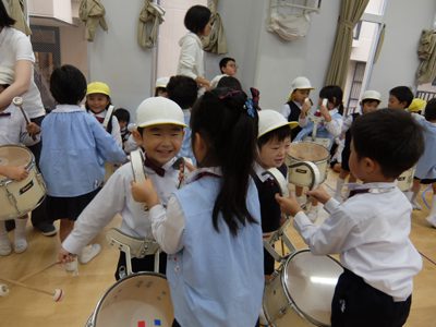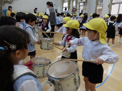 年中さんは年長さんにリズムをとってもらいながらドラムマーチのリズムを叩いていました。