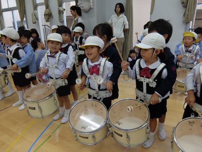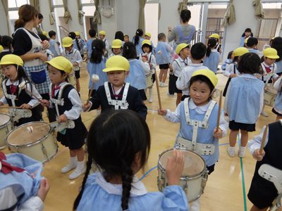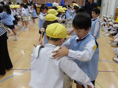 運動会でのマーチングが終わり、年長さんが年中さんに太鼓の引き継ぎをしました。