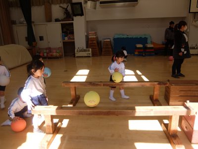 今回はボールを使って、いろいろな運動に挑戦しました。
