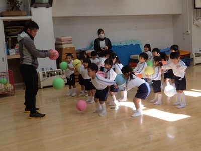 園では年少さんは講師の先生による体育遊びに参加しました。