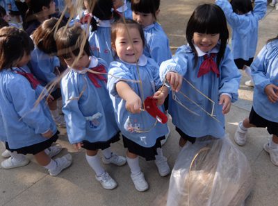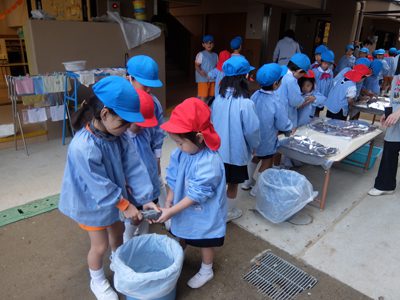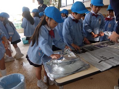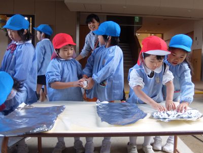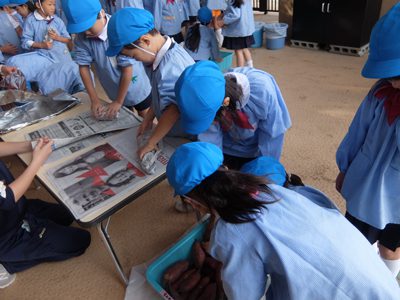 年少さんは年長さんに手伝ってもらい、焼き芋の準備をしていました。