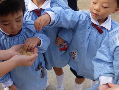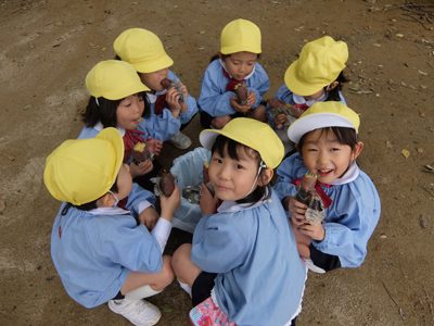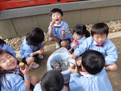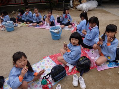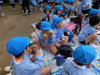 年長さんはレジャーシートを敷いて、焼き芋に続き、おにぎり弁当も美味しく戴きました。
