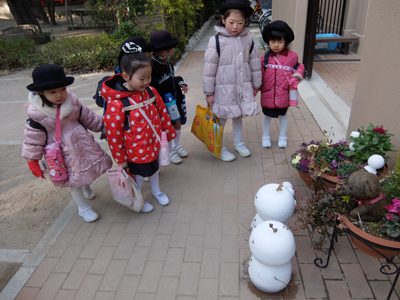 登園前、子ども達は足を止めて、雪だるまに見入っていました。