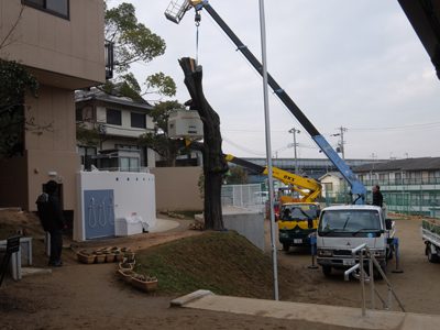 旧園舎時代からテントを突き抜けさせてまで守ってきた大きなシイの木ですが、この季節になっても全く芽吹かず枯れてしまっていることが確認されましたので、やむを得ず週末に切らせてもらいました。