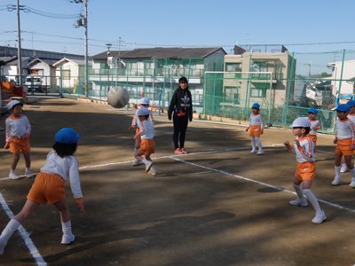 寒さに負けずに年長さんの体育遊びは園庭でドッチボールをしました。