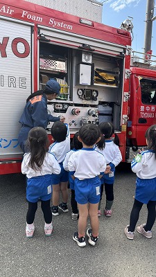 普段なかなか近くで見ることのできない消防車に、子どもたちは興味津々で、目を輝かせていました。