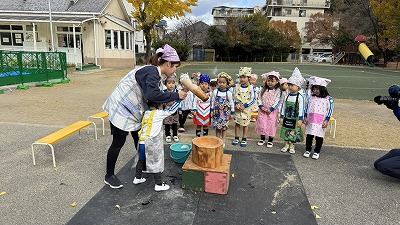 いよいよお餅つきが始まると、「よいしょー!よいしょー!」の元気な掛け声に合わせて、先生たちが力強くお餅をつきました。その声に合わせて、子どもたちも大盛り上がり。