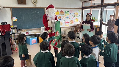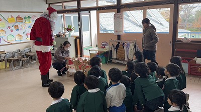 その後、サンタさんは各教室にも来てくれて、こどもたち一人ひとりにプレゼントを渡してくれました。こどもたちからもサンタさんへプレゼントを渡しました。家に飾ってくれるそうです!