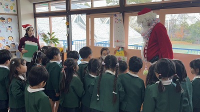 すると、なんとサンタクロースが登場!こどもたちは「先生がサンタさんかな?」と思っていたようですが、本物のサンタさんが現れてびっくり。英語で元気にあいさつをする姿も見られました。サンタさんには「何歳なの?」「トナカイはどこにいるの?」など、たくさんの質問をしていました。