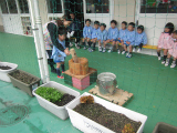 お餅つきを見る前に、先生からのお話でお米がお餅になることを知りました。