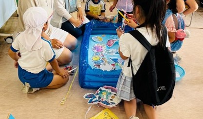 地域の皆さまにもご参加いただき、講堂では元気いっぱい盆踊りを踊り、その後は各教室で千本引き、めいろ、さかなつりなどの楽しいゲームを楽しみました。