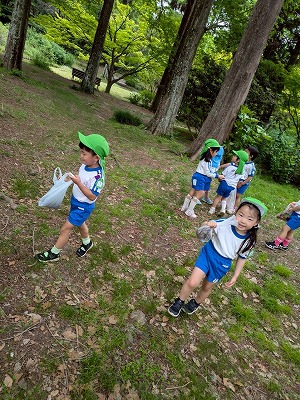 たんぽぽやちょうちょを見つけて追いかけたり、どんぐりを拾ったりと、自然の中でのびのびと遊ぶ子どもたちの姿がとても印象的でした。