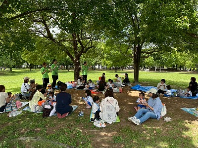 親子でふれあい遊びをしたり、自然の中でのんびりと過ごしたり。木陰でお弁当を広げる時間も、笑顔がいっぱいのひとときでした。
