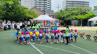 広い芝生の上では、先生のかけ声で元気いっぱいパラバルーンをしました。